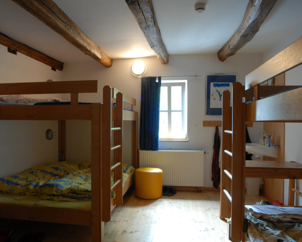 Im Obergeschoß gibt es 20 Betten, verteilt auf 2 Vierbettzimmer und 2 Sechsbettzimmer, 2 Bäder mit Dusche und WC.